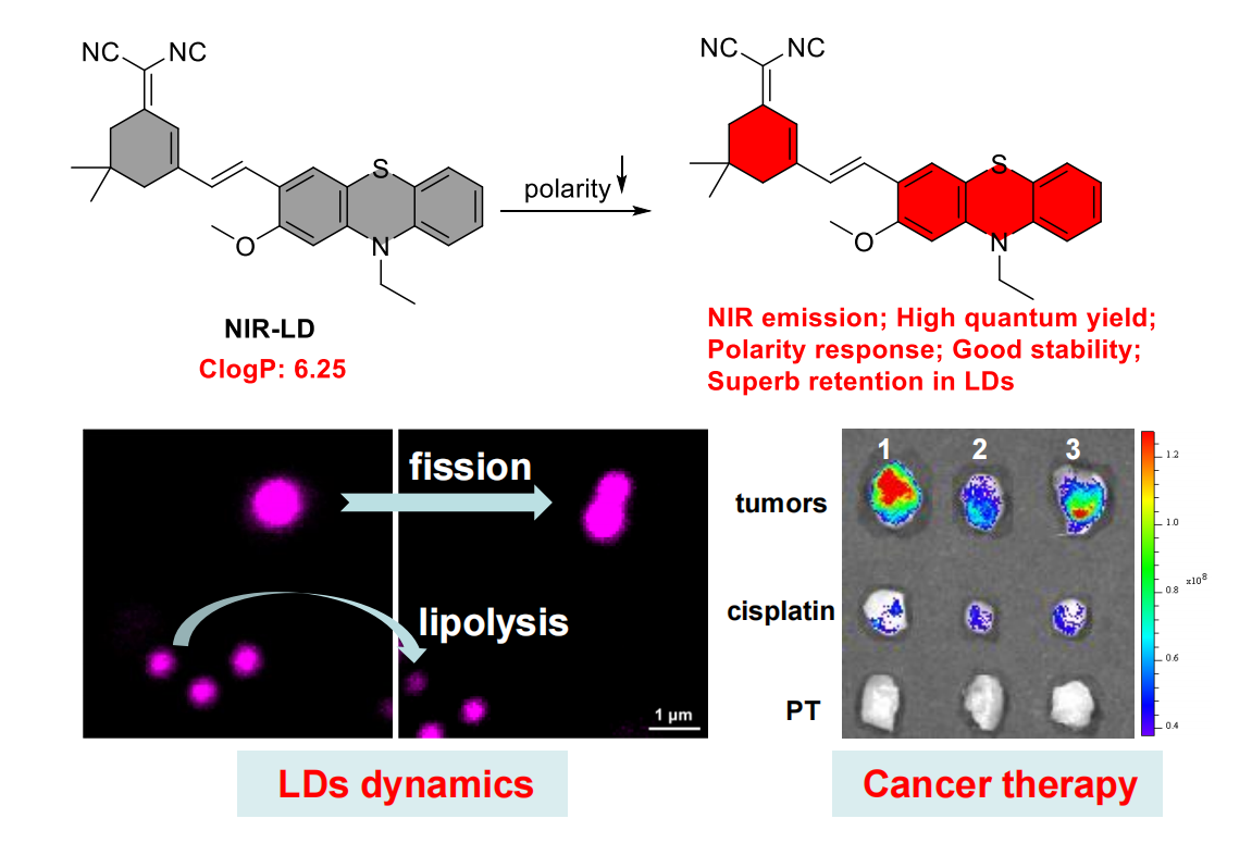 脂滴(LDs)与多种疾病密切相关,如肝病和癌症。近十年来,开发了许多LDs的荧光探针,但具有近红外(NIR)发射、高特异性和高稳定性的荧光探针仍然缺乏。本研究制备了一种吩噻嗪衍生的荧光探针,该探针具有合适的疏水性,ClogP为6.25,在低极性溶剂(如1,4-二氧六环)中具有681 nm的强发射,可以实现LDs的近红外成像。该探针被证明具有较高的化学稳定性,极好的pH耐受性和优异的抗光漂白能力。该探针可以在不同条件下监测活细胞中LDs的极性、大小和数量的变化。此外,在一段时间内,LDs的各种形态动力学能被可视化,包括融合、裂变、脂质转移、LDs生长和脂质分解。利用顺铂的近红外特性,实现体内肿瘤成像,并首次在三阴性乳腺癌小鼠模型中以LDs作为生物标志物,初步评估顺铂的治疗效果。结果表明NIR-LD是LDs相关疾病的潜在的有效显像剂。