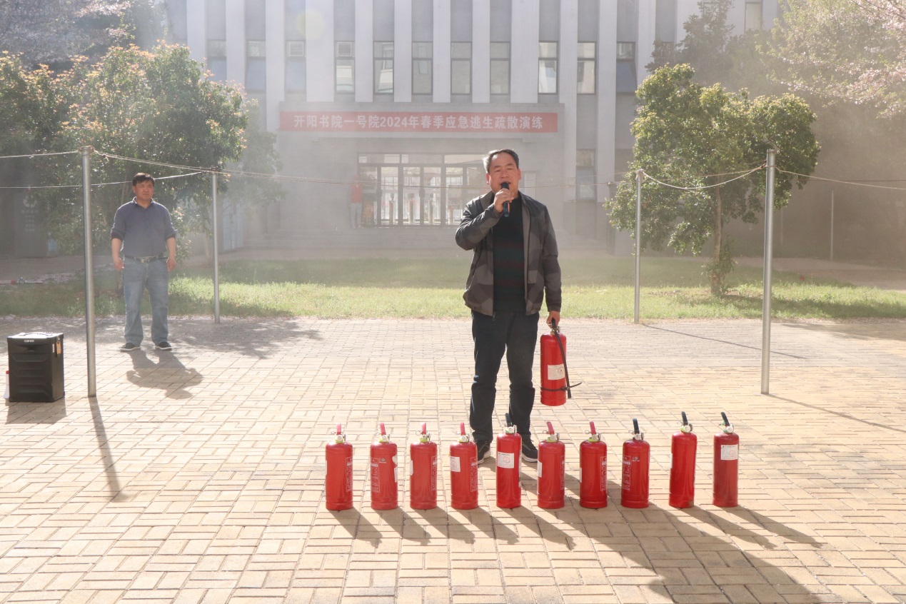 学校保卫处消防科科长翟国强向在场学生详细介绍干粉灭火器使用方法
