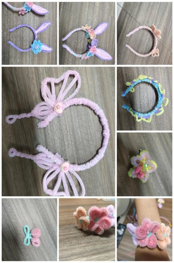 此次活动旨在通过“扭扭棒”这一富有创意和趣味性的手工材料,激发参与者的创造力和想象力,让他们在制作过程中体验到美的力量和魅力。活动现场,五颜六色的扭扭棒和各式各样的手工材料摆满了桌面。参与者们纷纷拿起扭扭棒,发挥自己的创意和想象力,开始制作各种独特的手工艺品。同学们通过线上教学视频学习了制作扭扭棒作品的技巧和方法,同学们都大胆尝试,勇于创新,自信地投入到创作中,现场氛围热烈而活跃。活动结束后,有的制作了精美的花束,有的则打造了可爱的动物造型,还有的创意无限,将扭扭棒与其他材料结合,创作出独具特色的作品。在此次活动各种充分发挥自己的想象力和创造力,用“扭扭棒”制作出了各种各样精美的手工艺品。这些作品不仅展示了同学们的巧思妙想,更在无形中提升了他们的审美情趣和动手实践能力。