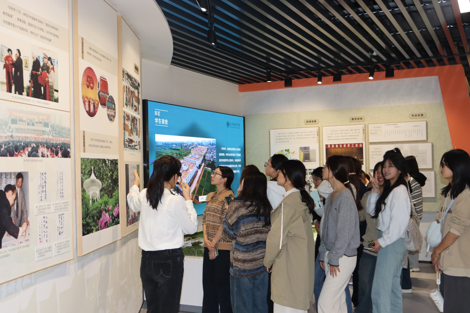 在薪火讲解团讲解员的引导与解说下,同学们参观了校史馆内一张张珍贵的老照片和一段段文字记录,对学校的历史沿革、学科建设、师资队伍、人才培养以及国际交流等方面有了更全面、更深入的认识,深切地感受了学校厚重的文化积淀、丰硕的办学成果和奋发的进取精神。