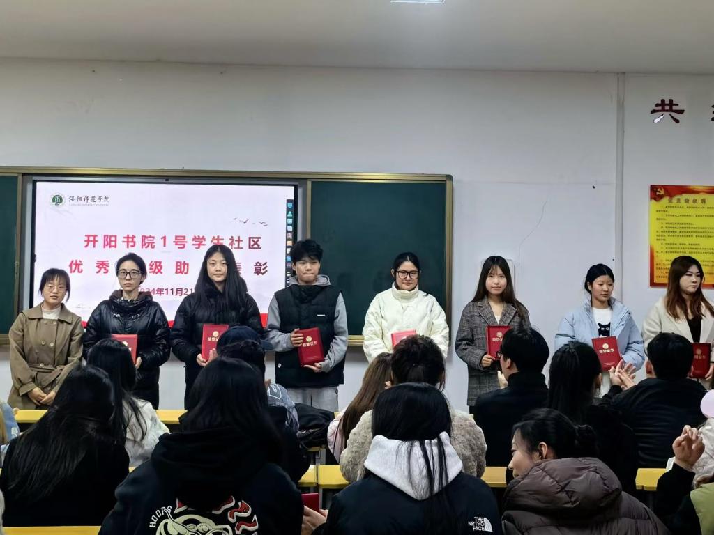 学院新闻为发挥榜样示范带动作用,11月21日下午,我院联合开阳书院1号学生社区召开表彰大会,书院学生发展中心主任邢艺潆、党建与思政办公室副主任葛胜涛、育人导师孟铜宁及书院学生代表参加本次大会。本次大会由葛胜涛主持。