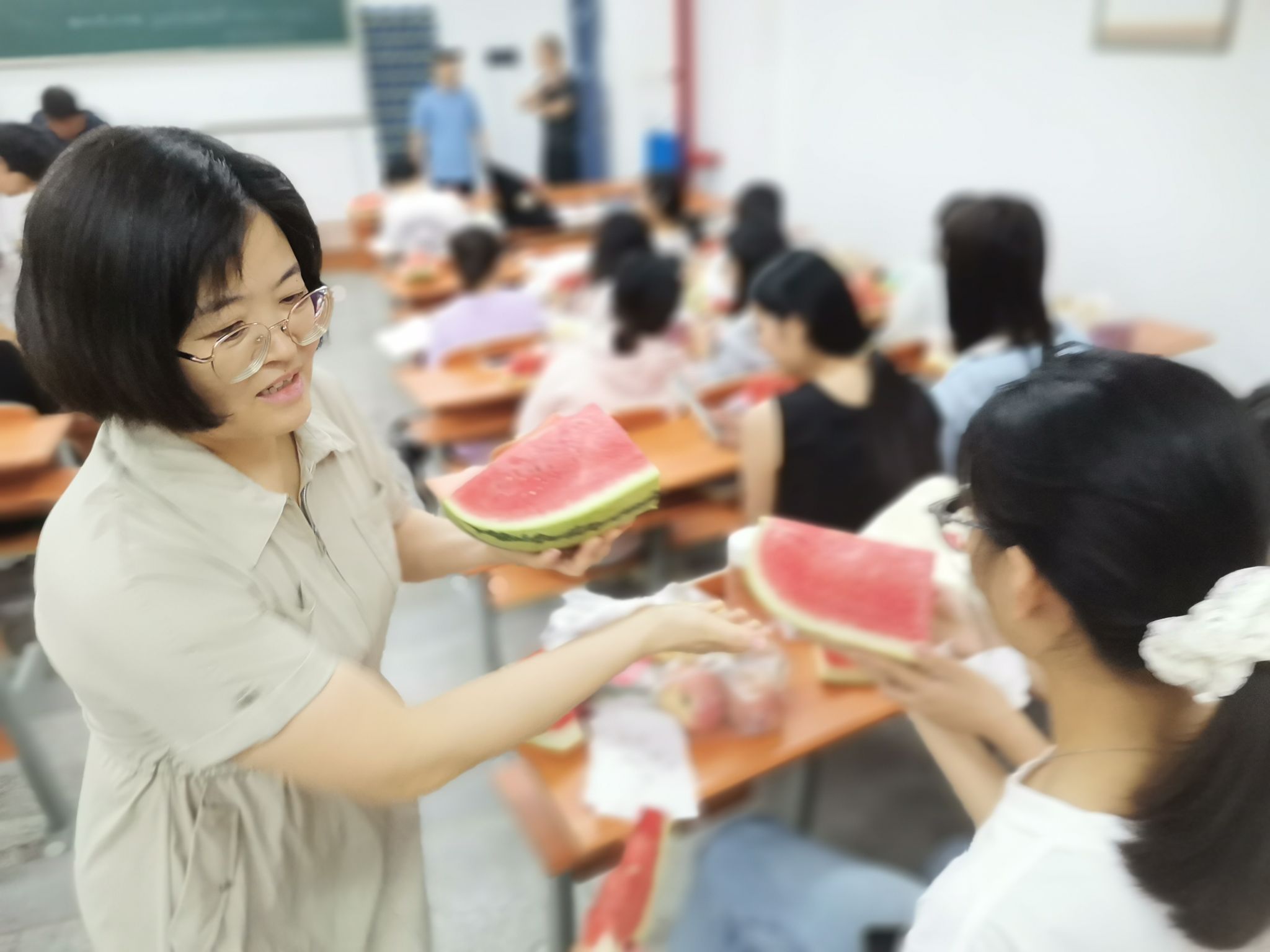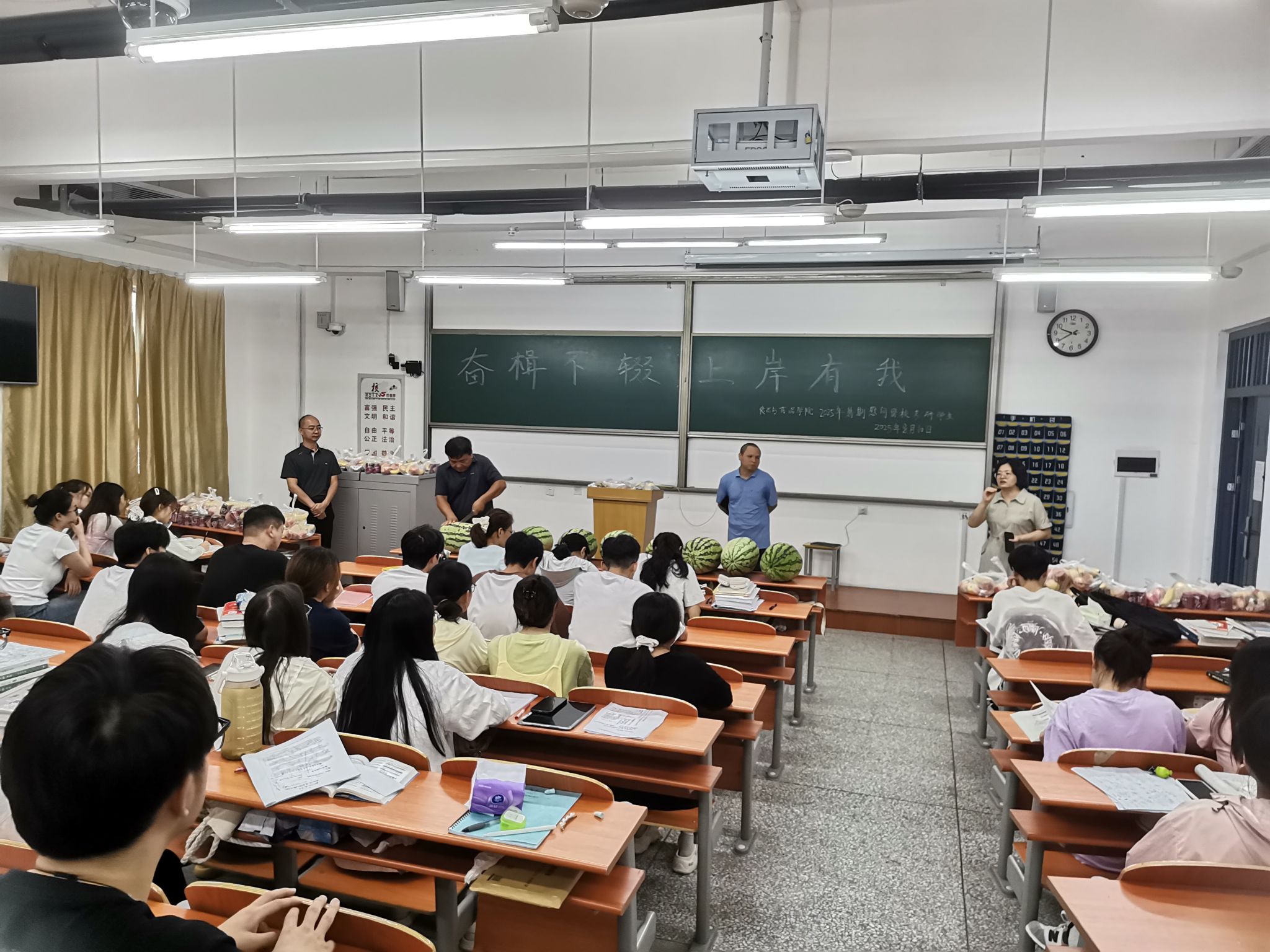 随后,学院老师们亲手将精心准备的“暑期清凉关怀包”送到每一位同学手中。关怀包内包含了解暑饮料、清凉水果、牛奶等实用物资,饱含着学院对学子们细致入微的关怀和考研成功上岸的美好祝愿。