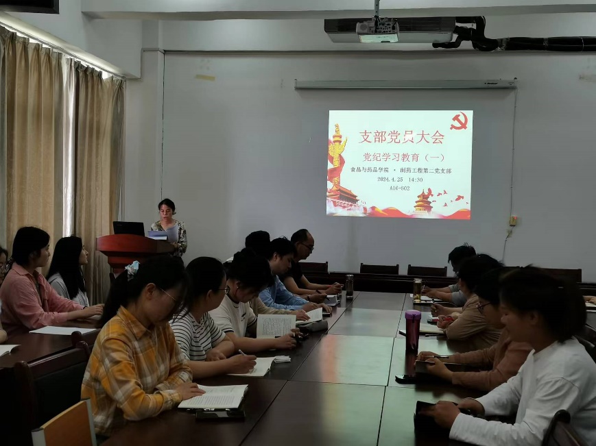 为扎实推进支部党纪学习教育,提高支部党员的纪律意识和党性修养,4月25日下午,制药工程第二党支部书记王聚财在学院502会议室为支部党员讲授党纪学习教育专题微党课。