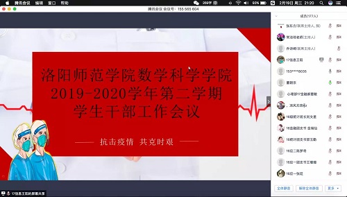 为贯彻落实党中央、省委省政府、我校对于新冠肺炎疫情防控工作的决策部署,坚决防止疫情在校园里发生,2月19日晚上我院召开以“抗击疫情,共克时艰”为主题的2019-2020学年第二学期学生干部线上网络会议。我院党委书记董朝宗、副书记赵文艳、团委副书记常洁琼、全体辅导员老师及全体学生干部参与本次会议,会议由团委副书记常洁琼老师主持。