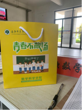 学院为每一位数学科学学院的毕业生都准备了毕业礼物,并统一订制了印有数学科学学院毕业寄语的黄色小袋子,在洛师校园,在返乡途中,只要看到这个黄色袋子,就一定能够认出彼此——永远的数院人。全院教职员工用热情的服务和真挚的祝福助力毕业生扬帆远航。