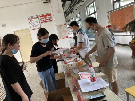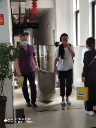 返校毕业生拉着曾经的任课老师一起拍照,与老师们交流着考研、就业、创业的话题,更有许多学生干部参与到教工志愿服务工作中来,他们跟随教工志愿者帮助同学们搬运行李、打包邮寄,挥汗如雨间尽显数学科学学院师生情谊。