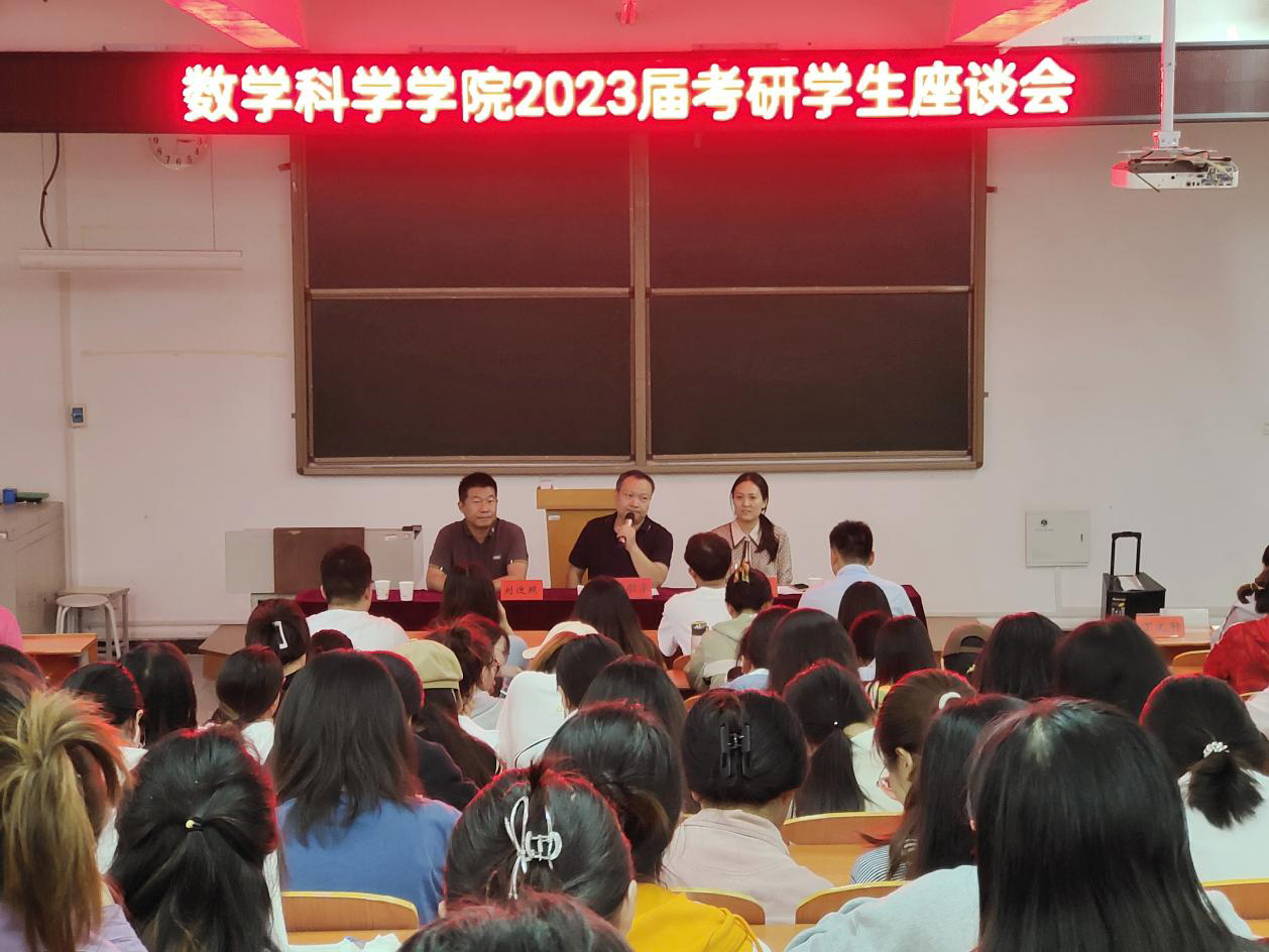 首先,董朝宗从历年我院学子报考情况、目标院校选择、报录比等方面向大家进行介绍。其次,现场同学对自己考研中存在的问题进行咨询,各位领导对提出的问题进行一一作答,有效的解决了大家在考研中存在的急难愁盼的问题。紧接着,刘迎照从专业课的备考、后期考研时间安排和备考心态调整等为同学们进行指导,分享了考研过程中学长学姐备考的经验技巧,鼓励同学们脚踏实地,刻苦努力,做到敢于有梦、勇敢追梦、勤于圆梦。最后,董朝宗指出,一要坚定信心,提前规划,锚定目标,坚持不懈;二要目标适中,根据自己的实际情况和目标选择适合自己的学校和专业;三要强化时间管理,完善学习计划,注重劳逸结合;四要调整好心态,坚持到底,为最后的考研冲刺做好充分准备,希望都能够终将成硕,再创数院辉煌。