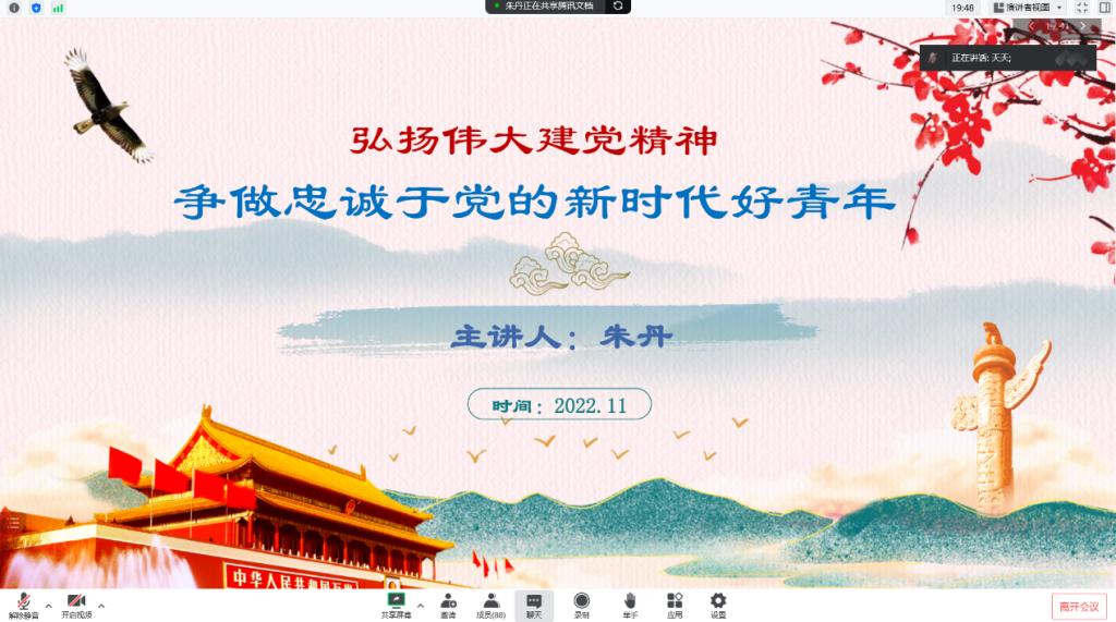 11月20日下午,我院邀请校工会办公室副主任朱丹为我院入党积极分子开展以《弘扬伟大建党精神争做忠于党的新时代好青年》为专题的党课培训。