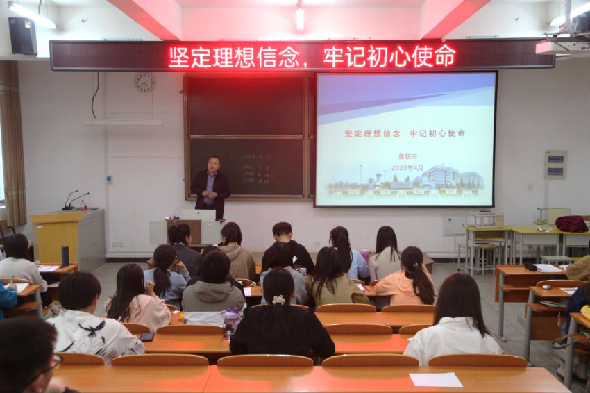 董朝宗从理想信念和初心使命是百年来激励中国共产党人不懈奋斗的根本动力、理想信念和初心使命不是空洞的,而是可衡量、可检验的和坚定理想信念,牢记初心使命必须持续努力三大方面展开,强调广大青年学子要树立远大的理想信念,树立对马克思主义的信仰、对中国特色社会主义的信念、对中华民族伟大复兴中国梦的信心,坚定不移听党话、跟党走,立志做有理想、敢担当、能吃苦、肯奋斗的新时代好青年,积极投入到学院的服务建设中去,用责任撑起信念,让青春在奉献中闪光,以青春之我、奋斗之我,为自身发展铺路架桥,为祖国建设添砖加瓦。