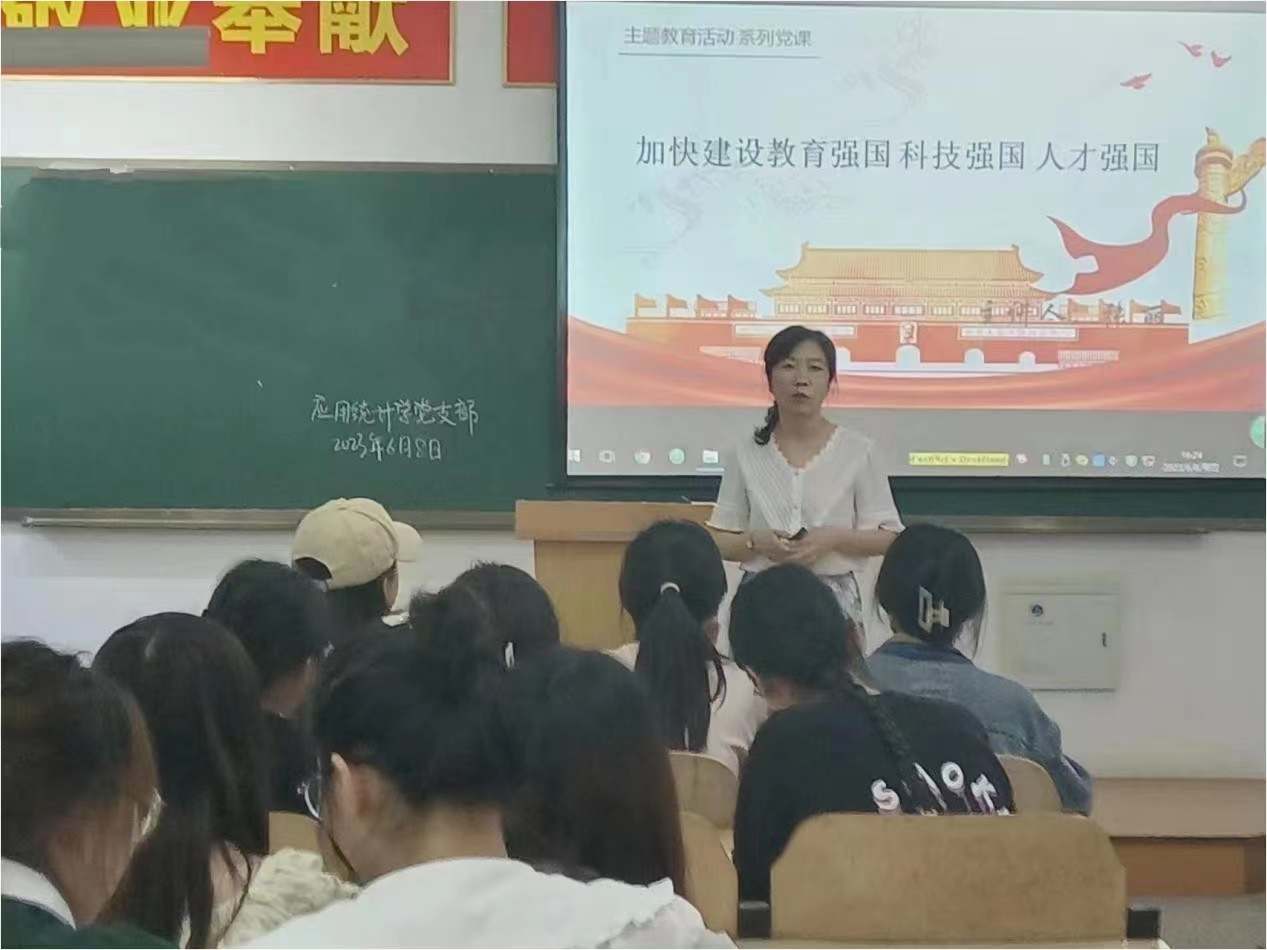 为深入学习贯彻习近平新时代中国特色社会主义思想,提升基层党支部政治素养,进一步坚定理想信念,锤炼党性修养、指导实践工作。6月7日下午,我院副院长张丽在A10-106以“加快建设教育强国、科技强国、人才强国”为题,为应用统计党支部全体师生党员作专题党课。