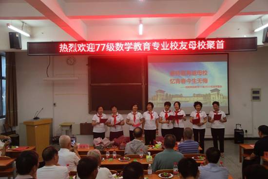 会上,77级校友满怀热情、激动地回忆着似水年华的校园时光。为老师们献花、敬茶,表达感激之恩,通过朗诵自创诗词和表演文艺节目表达着师生情、同学忆;班主任李汉章再次点名,让校友们重温学生时代;刘迎照代表学院对77级校友重回母校表示热烈的欢迎,同时向校友们汇报了学校和学院目前发展情况,希望校友们一如既往的支持学校的发展,并祝福各位校友身体健康,万事如意!