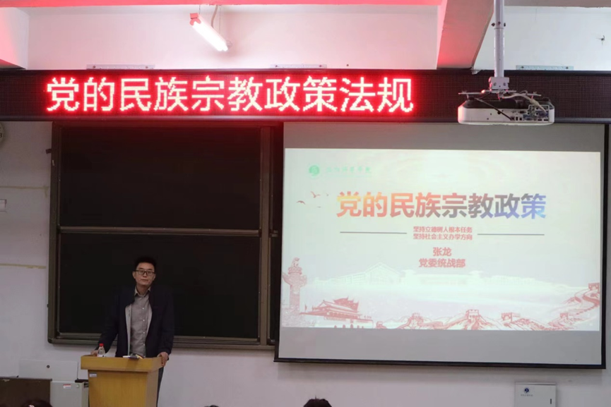 张龙从党的民族政策、党的宗教政策和相关政治法规等三个方面进行讲授,张龙指出,大学生要深刻领悟习近平新时代中国特色社会主义思想的重大意义,学习习近平总书记关于加强和改进民族工作的重要思想,切实增强做好新时代党的民族宗教工作的政治自觉、思想自觉、行动自觉。铸牢中华民族共同体意识,“石榴籽”相拥开出民族团结之花。同时张龙强调,大学生要相信科学、学习科学、传播科学,树立正确的世界观、人生观、价值观,自觉遵守国家关于宗教法律法规,自觉抵制校园传教和非法宗教渗透活动,为营造良好的校园文化环境贡献应有的力量。