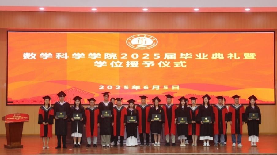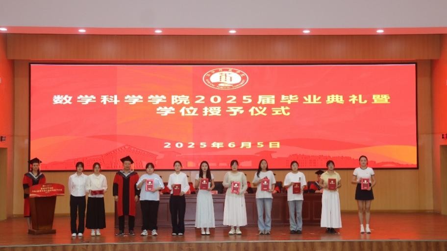 在学位授予环节,副院长余天虎、张丽先后宣读了《数学科学学院2025届研究生毕业生硕士学位授予决定》和《数学科学学院2025届本科生毕业生学士学位授予决定》,我院共有37名同学获得教育硕士学位、353位同学获得学士学位。我院学位评定委员会委员向学院研究生、本科生毕业生代表颁发学位证书、拨苏正冠,并合影留念。