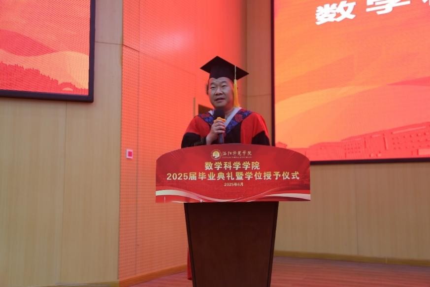 随后,院长刘迎照寄语:“亲爱的同学们,从今天起,你们将从洛师数院出发,奔赴星辰大海。请记住,你们不仅是数学公式的求解者,更是自己人生的定义者;你们不仅是定理的证明者,更是未来的创造者。愿你们牢记‘敬业奉献、为人师表’的校训,以数学人的智慧与坚韧,书写无愧于时代的华章!无论你们走向何方,母校的坐标永远在这里。也让我们把最真挚的祝福送给在座的全体老师们,感谢老师们用一支粉笔写尽春秋,用三尺讲台孕育芳华!愿老师们桃李满园时,依旧笑若方程的最优解!”
