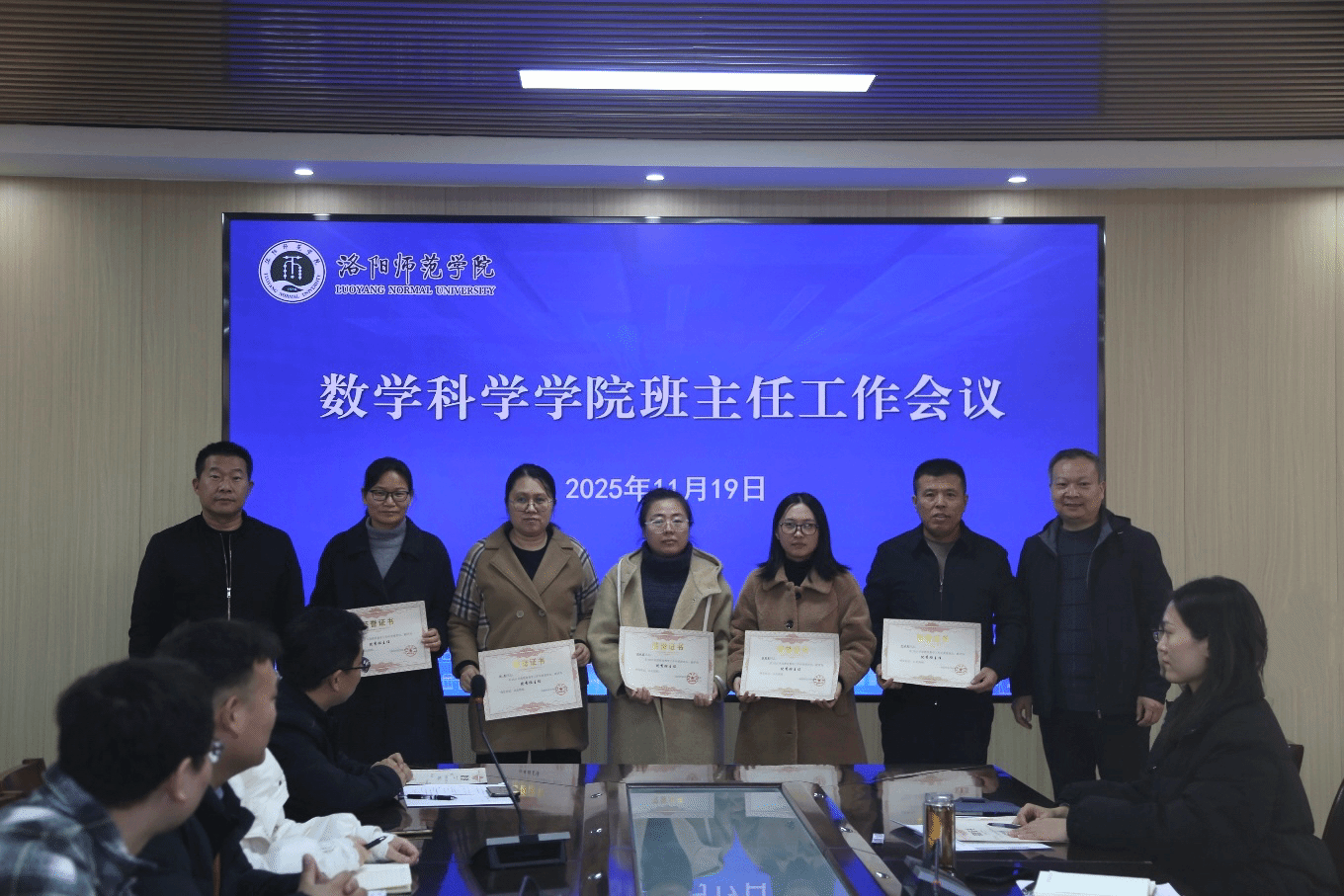 会上,刘迎照宣读了《关于表彰2025年度优秀班主任的决定》,董朝宗和刘迎照为张慧慧等7位优秀班主任颁发荣誉证书并合影留念。优秀班主任代表胡秋霞、包洪亮和宋巧珍分别结合实例交流分享了自己在学生思想引领、学业预警与帮扶和护航学生成长等方面的工作经验与育人心得。