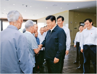 2019年5月20日至22日,中共中央总书记、国家主席、中央军委主席习近平在江西考察,主持召开推动中部地区崛起工作座谈会并发表重要讲话。这是习近平在赣州市于都县中央红军长征出发纪念馆会见于都县的红军后代、革命烈士家属代表。新华社记者 鞠鹏/摄