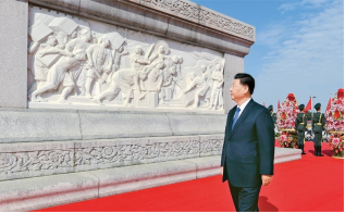 2020年9月30日上午,党和国家领导人习近平、李克强、栗战书、汪洋、王沪宁、赵乐际、韩正、王岐山等来到北京天安门广场,出席烈士纪念日向人民英雄敬献花篮仪式。这是习近平瞻仰人民英雄纪念碑。新华社记者 岳月伟/摄