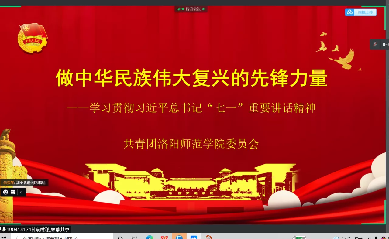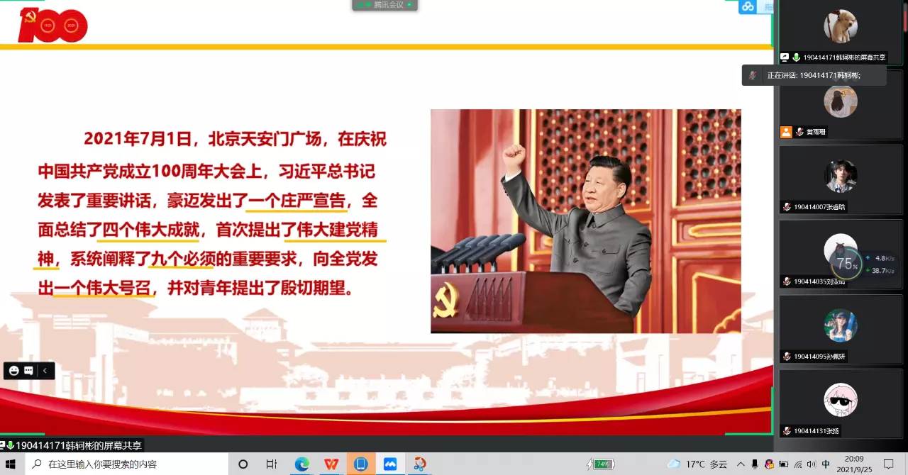 通过此次学习,同学们共同回顾了这100年来中国共产党走过的道路,风雨兼程、筚路蓝缕,是党带领人民群众开辟了新出路,建立了新事业;是无数共产党人抛头颅、洒热血换来了今天的美好生活。正如习近平总书记所说的“未来属于青年,希望寄予青年”,作为新时代新青年,我们生逢盛世,更应倍加珍惜现在的美好物质文化生活,要从党的百年光辉历程之中汲取磅礴之力,大气之魂,以实现中华民族伟大复兴为己任,不忘初心、牢记使命、不负青春、不负韶华。