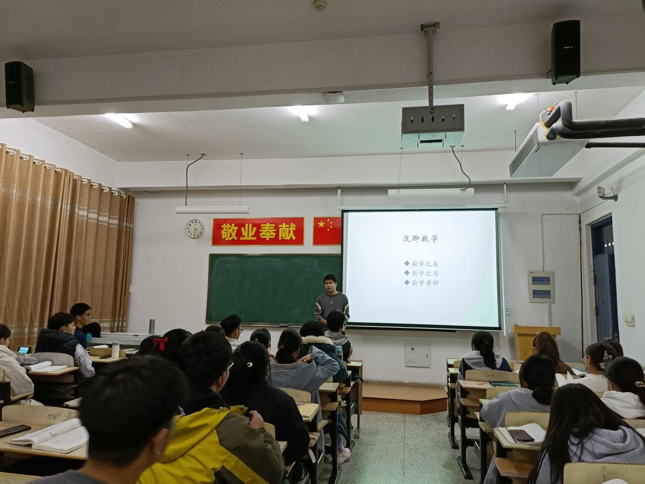 为了帮助新生们更好的了解数学知识以及数学学科学习方法,提高学习兴趣,21级数学与应用数学一班于11月25日展开一场学术研讨。主讲老师韩要闯为同学们带来自己对于数学的一些见解。