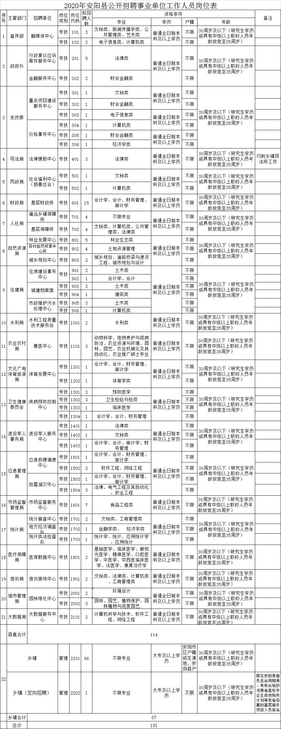 一、招聘范围、对象和条件(一)招聘范围、对象一是面向社会招聘县直事业单位工作人员114名;二是面向安阳市区户籍、生源地或安阳县户籍、生源地招聘乡镇所属事业单位工作人员66名;三是面向在安阳县服务期满且考核合格的河南省高校毕业生“政府购岗”计划等基层服务项目人员定向招聘乡镇所属事业单位工作人员1名。(二)应聘条件应聘人员必须具备下列条件:1.具有中华人民共和国国籍;2.遵守宪法和法律;3.具有良好的品行,身心健康;4.年龄条件:30周岁以下是指1990年5月1日及以后出生,35周岁以下是指1985年5月1日及以后出生;5.专业条件:应聘人员所学专业与招聘岗位要求的专业一致,有专业类别要求的,参照《2019年河南省考试录用公务员专业设置指导目录》(附件3);6.在职人员报名需提供单位主管部门开具的同意报考证明;7.岗位所需要的其他条件。具体招聘单位、岗位、专业、人数和资格条件等详见《2020年安阳县公开招聘事业单位工作人员岗位表》(附件1)。