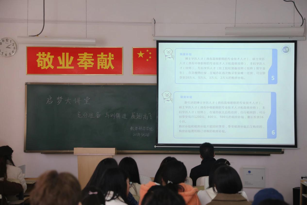 会议伊始,远老师以国家大环境为切入点,就目前的就业形势作出深入分析,并对洛阳青年友好城市政策进行相关讲解,人才公寓、青年驿站、租房补贴等13条硬举措助推青年向梦远航。接着,远老师指出精确自我认知,明确奋斗目标,找准人生定位,做好充分准备是同学们走向成功的第一步,鼓励同学们积极参与实践活动来增强自身的专业能力,提升社会竞争力。紧接着,他从择业心理、求职材料、面试礼仪等方面具体讲述了“提前做好充足准备”对就业的重要性,通过分享求职经历深入解读简历的内涵价值,畅谈面试背后的小技巧。最后,远老师呼吁大家精准定位,不断丰盈、充实自身,与时俱进,以自身奋斗改变命运,以不懈努力追求梦想。