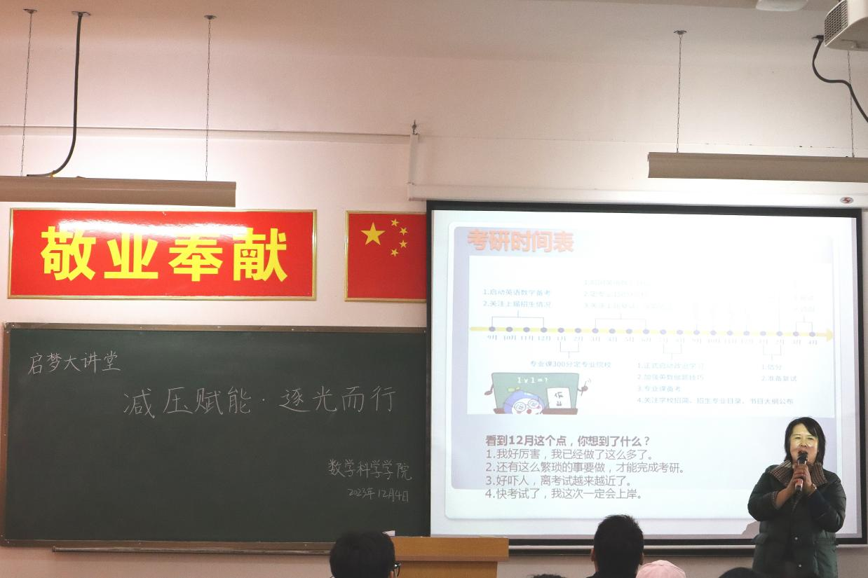 全国研究生考试临近,为缓解我院学生的考研焦虑,正确认识在考研准备过程中的心理压力,掌握科学减压方法,我院于12月4日在A10-207举办以“减压赋能逐光而行”为主题的启梦大讲堂讲座。辅导员张浩、丁文轩,2020级部分考研学生和2021级“凌云计划”考研加强班学生参加讲座,国家二级心理咨询师李晓茹担任主讲人。