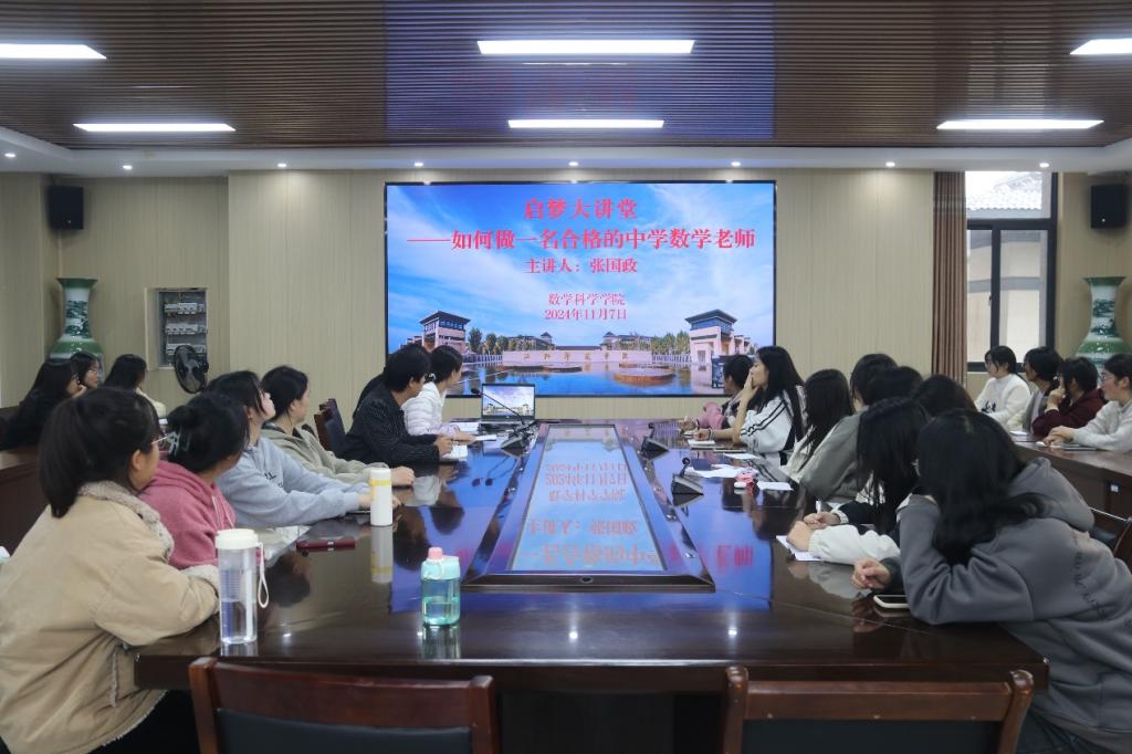 为提升数学师范类学生的教学能力和教学素养,2024年11月7日下午,我院于A10-317举办以“如何成为一名合格的中学老师”为主题的启梦大讲堂。此次讲座邀请汝州外国语高级中学校长张国政担任主讲人,我院党委副书记马天天、毕业班辅导员张浩、就业创业办副主任丁文轩及23、24级公费师范生同学参加。