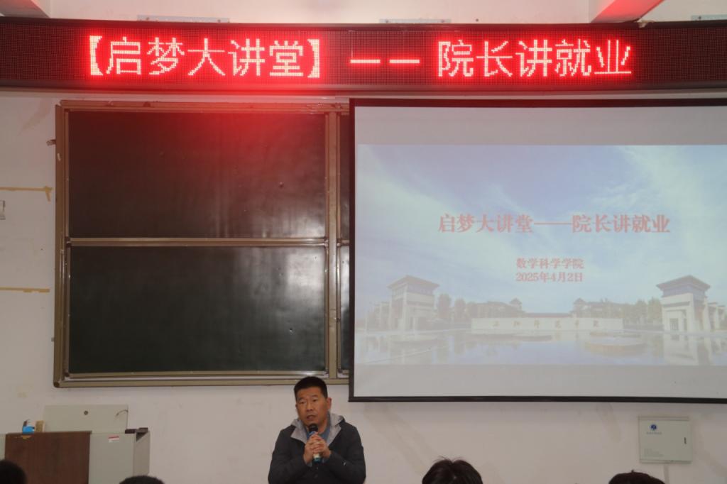 为凝聚共识、精准施策,全力推进2025届毕业生就业工作,4月2日,数学科学学院在数学楼A10-103举办【启梦大讲堂】——院长讲就业活动。院长刘迎照担任主讲人,就业创业办公室副主任丁文轩、毕业班辅导员及毕业生代表参加活动。