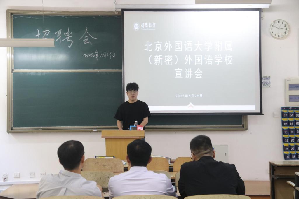 为满足教育行业对优质人才的需求,搭建高效人才交流平台,5月29日,北京外国语大学附属(新密)外国语学校专场宣讲会在数学科学学院顺利举行。我校毕业生积极参与,现场气氛热烈。