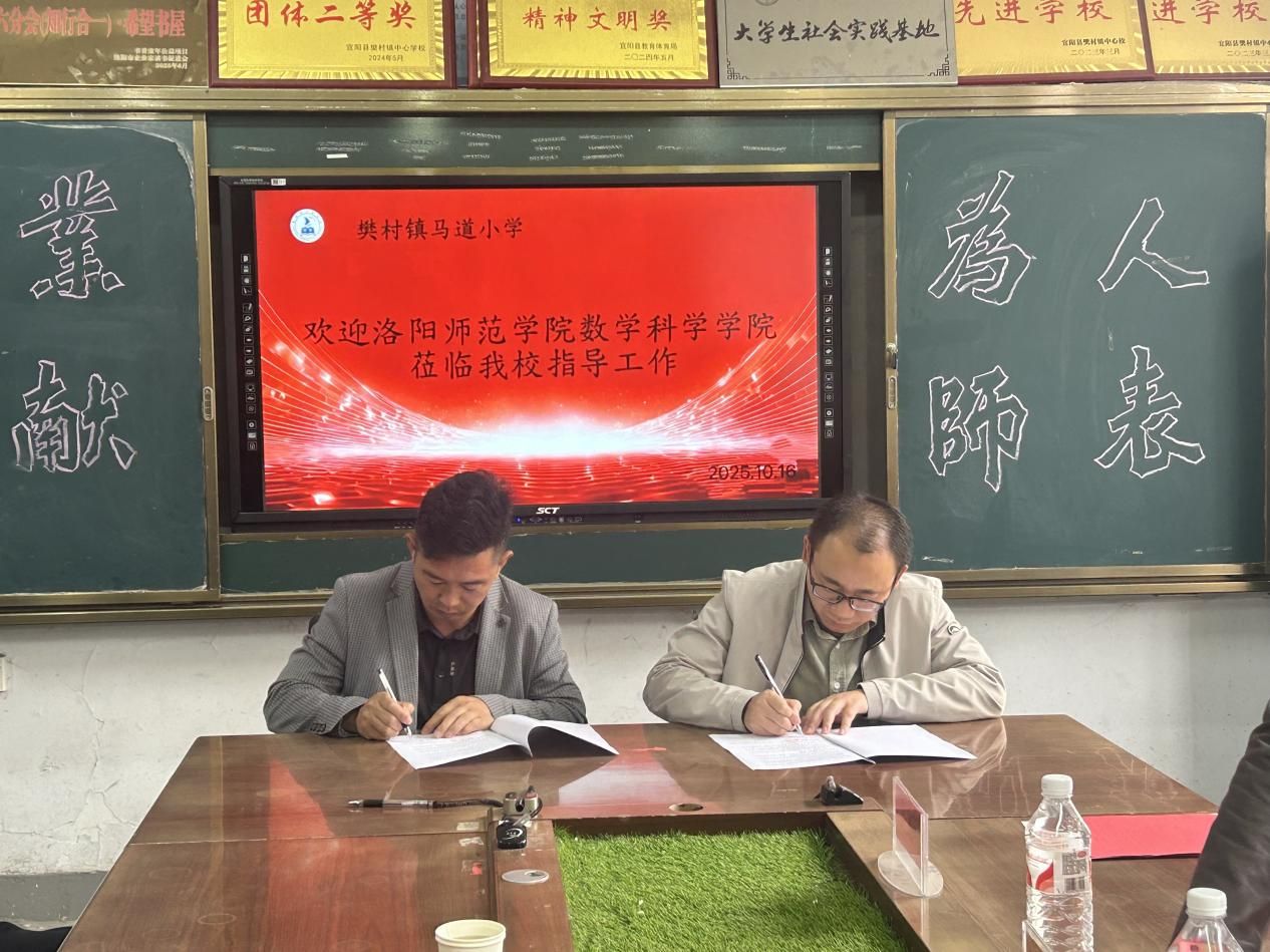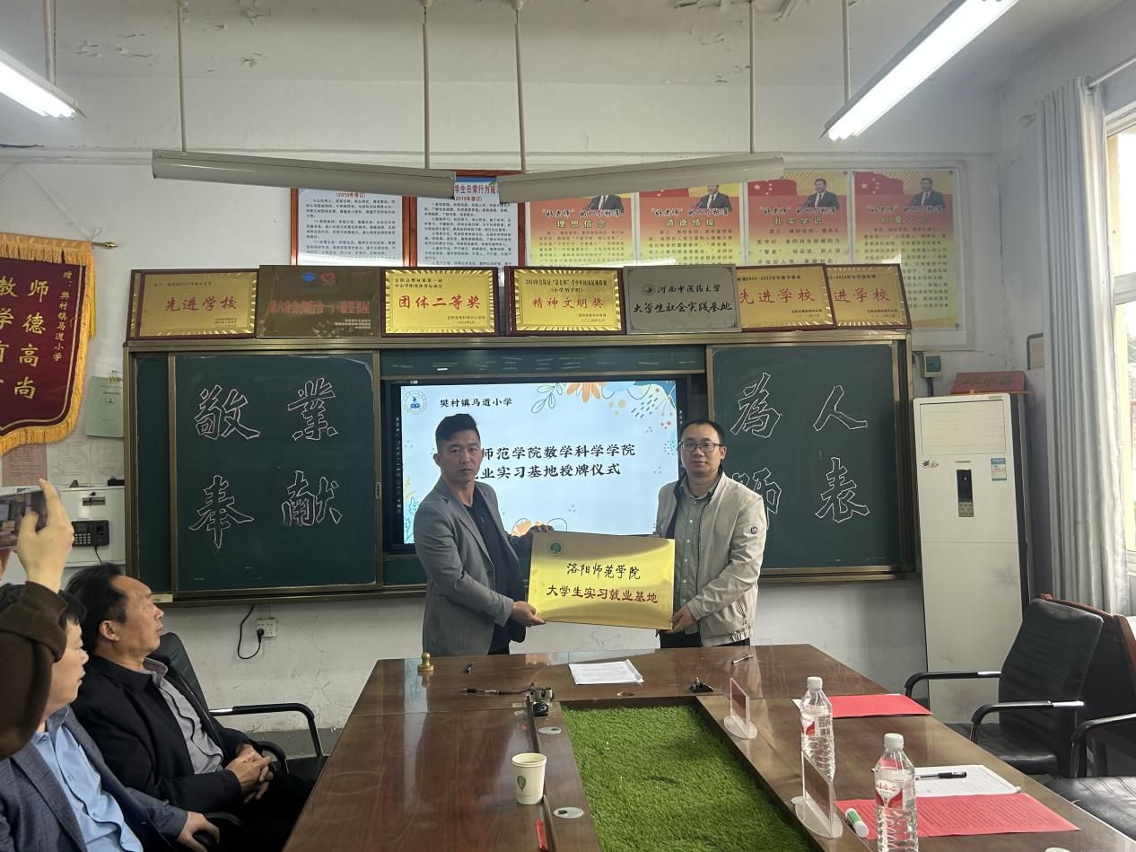 在宜阳县樊村镇马道小学,马天天一行首先参观了校区环境、听取了学校的基本情况、发展理念和文化特色,观察了教室环境、师生互动、教学方式等情况,并与学校领导及教师进行了座谈交流。双方围绕师资队伍建设、教育教学改革、实习就业等内容进行深入探讨,就校校合作、学生实习进一步达成共识,并共同签署《共建大学生实习就业基地协议书》,向该单位授牌“洛阳师范学院大学生就业创业基地”。