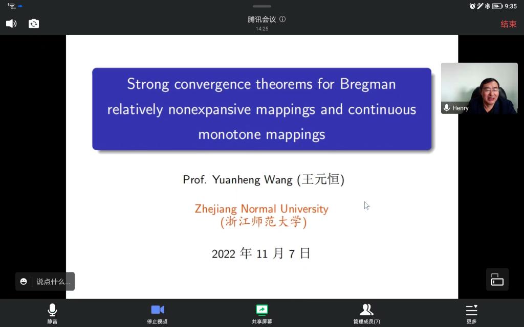 2022年11月9日上午,浙江师范大学王元恒教授应邀为数学科学学院教师和研究生作了题为《Strong convergence theorems for Bregman relatively nonexpansive mappings and continuous monotone mappings》的专题线上讲座。