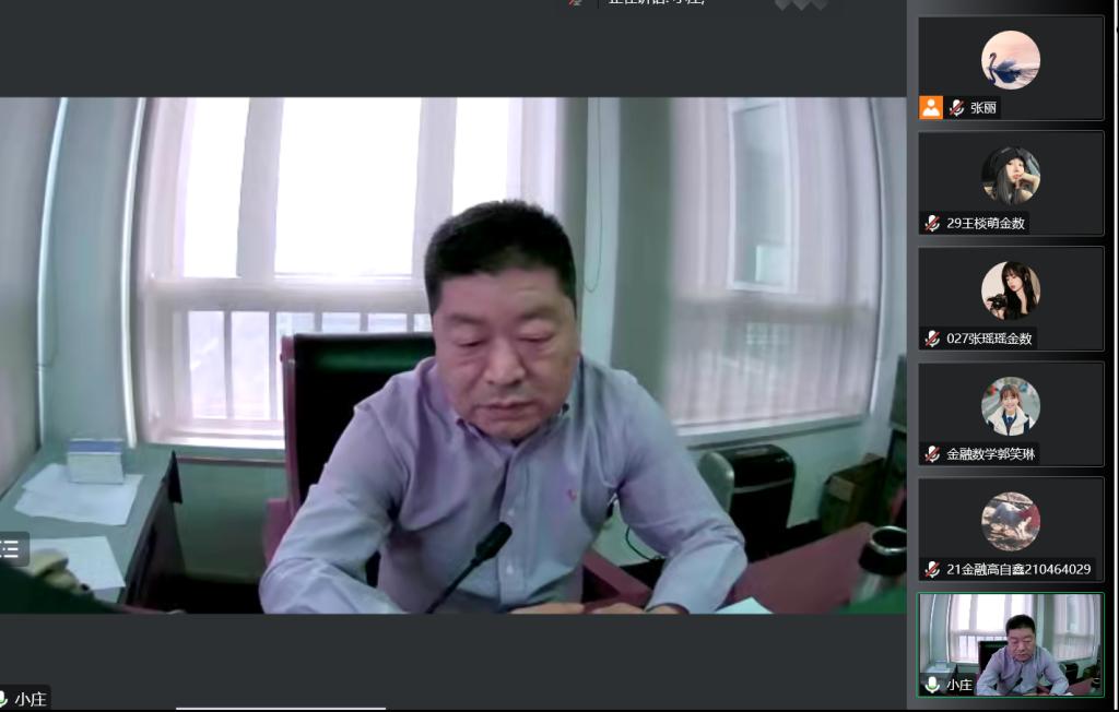 为提升学生的实践能力,增进校企合作的示范作用,12月8日下午,我院邀请洛阳金财融资担保有限公司监事会主席周健做了题为《青春万岁》的专题讲座。本次讲座通过腾讯会议在线上进行,我院金融数学专业相关老师和学生参加了此次讲座。