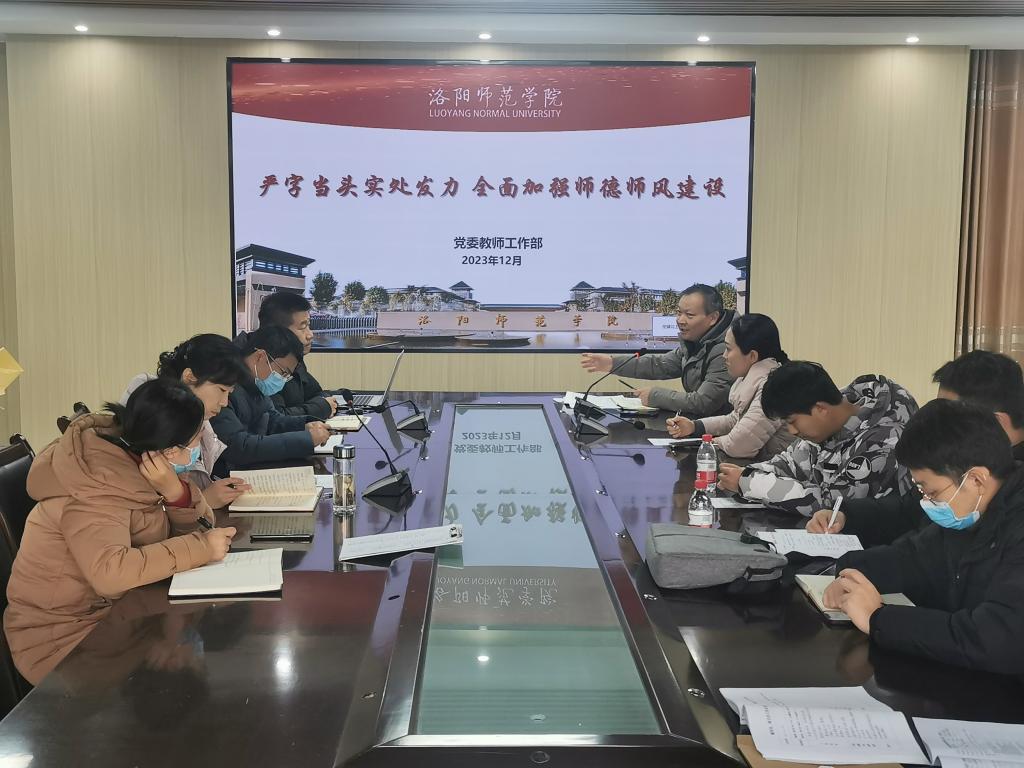 董朝宗以“严字当头实处发力 全面建设师德师风建设”为题,带领大家深入学习习近平总书记关于师德师风的重要论述,系统梳理新时代高校教师队伍建设新要求,分析加强高校师德师风建设的着力点,逐条解读《洛阳师范学院教室师德师风考核办法》。他针对不同类型违反师德师风的典型案例进行了剖析,要求广大教职工应时刻将师德红线牢记于心,厚植师德涵养,潜心教书育人。最后,他强调全体教职工要以师德标兵为镜,学习榜样精神,牢固树立“躬耕教坛,强国有我”的志向与抱负,自觉践行为党育人、为国育才初心使命,深入推进我校“三师一育”工程落地落实。