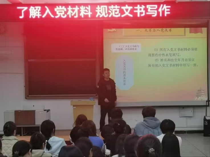 为进一步规范入党文书书写,提升入党积极分子和预备党员的思想觉悟与党性修养,我院辅导员薛雅琪于11月1日开展了以“了解入党材料,规范文书书写”为主题的专题党课。