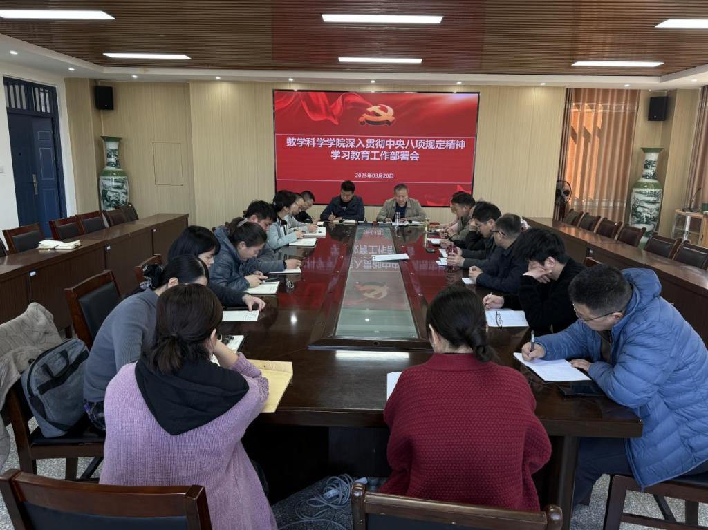 为深入贯彻党的二十届三中全会精神,巩固拓展主题教育成果,持续加强作风建设,数学科学学院于2025年3月20日下午在A10-317会议室召开深入贯彻中央八项规定精神学习教育工作部署会。学院党委委员及全体党支部书记参会,会议由学院党委书记董朝宗主持。