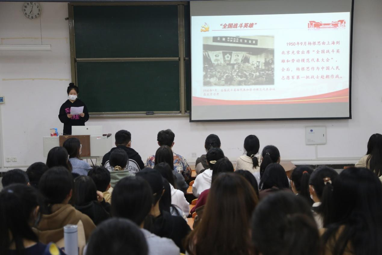 首先,来自新闻与传播学院的青年讲师李文佩慷慨激昂地讲解中国共产党的丰功伟绩,着重讲述了被改编为电影《长津湖》的杨根思事迹。她从杨根思的悲惨童年,到立下无数军功,最后光荣牺牲,他的光荣事迹影响了整个志愿军,也深深扎根于新时代的中国青年,站在百年未有之大变局的历史交汇点上的中国青年要勇担时代使命,不断奋斗进取,做新时代的奋进者;要敢于攻坚克难,上下求索不言弃,做新时代的开拓者;更要厚植家国情怀,心系人民,做新时代的奉献者。希望我们牢记习近平总书记对青年一代的殷切期盼,时刻听候党的召唤,在祖国和人民最需要的地方,贡献自己的青春力量。