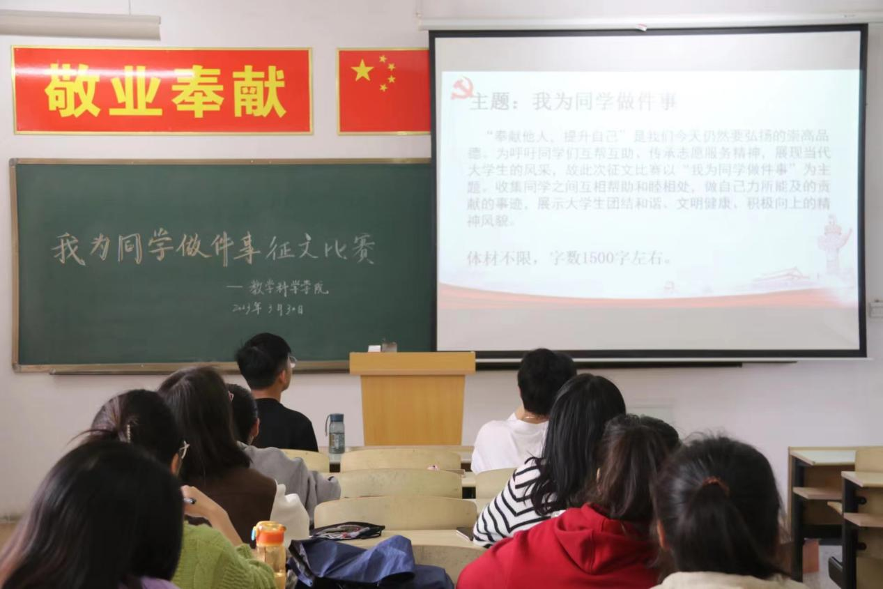 为丰富同学们的课余生活,传承志愿服务精神,弘扬崇高品德,提升文学素养,展现学子风采,3月30日下午,我院于A10-208举办“我为同学做件事”征文比赛。