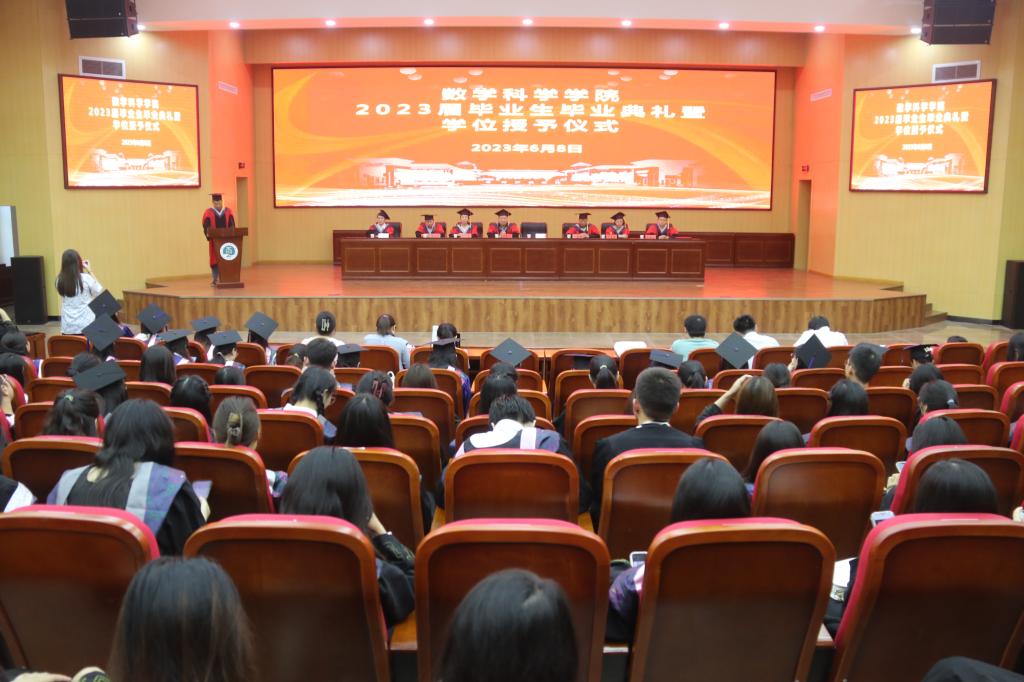 大会在雄壮的国歌声中拉开序幕,张丽宣读了《数学科学学院关于表彰2023届优秀毕业生的决定》。在欢快的乐曲中,毕业生代表依次走上典礼台。董朝宗为受表彰优秀毕业生代表颁发荣誉证书。王丰辉宣读2023届研究生硕士学位授予决定,张丽宣读2023届本科生学士学位授予决定。学位评定委员会委员为上台的研究生、本科毕业生拨苏正冠并授予学位,合影留念,留下这青春最美好难忘的瞬间。