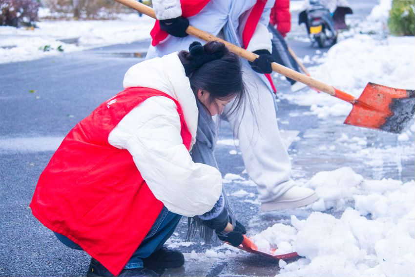 虽然气温较低、寒风阵阵,但是并没有阻挡同学们扫雪的热情和斗志,同学们“以雪为令,闻雪而动”,积极开展应对工作,除冰雪、保畅通,齐心协力保障师生出行。大家利用铁锹、扫帚等工具,齐心协力、默契配合、干劲十足,洁白的雪花映照着一张张因劳动而红彤彤的脸庞,扫雪队伍成了冬日校园别样的风景线。在大家的共同努力下,清除了道路上的积雪和冰块,为学校全体师生的安全出行提供了保障,极大地消除了安全隐患。我院青志部用志愿活动谱写了最美的风景,展现出我院学子乐于奉献的精神风貌。