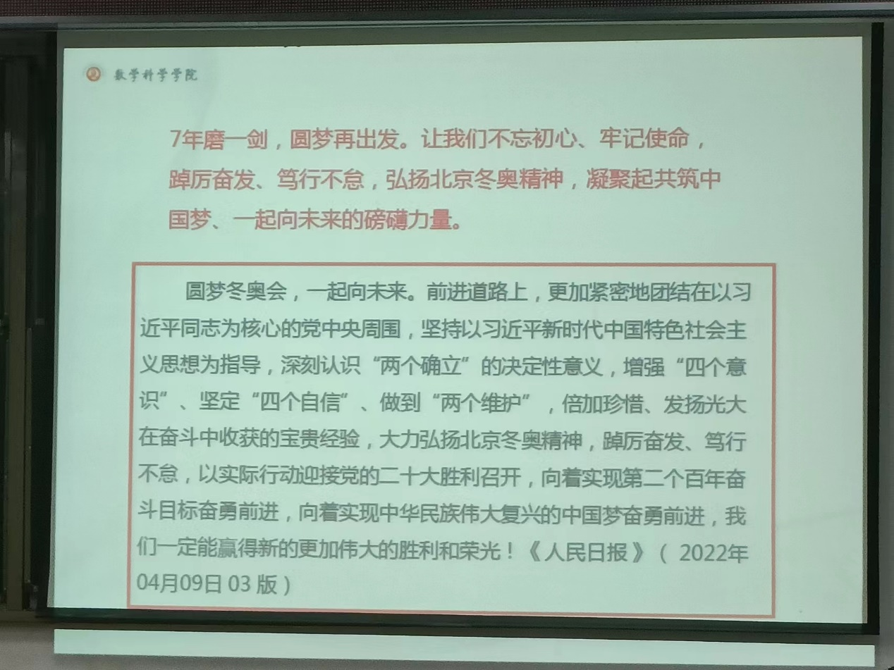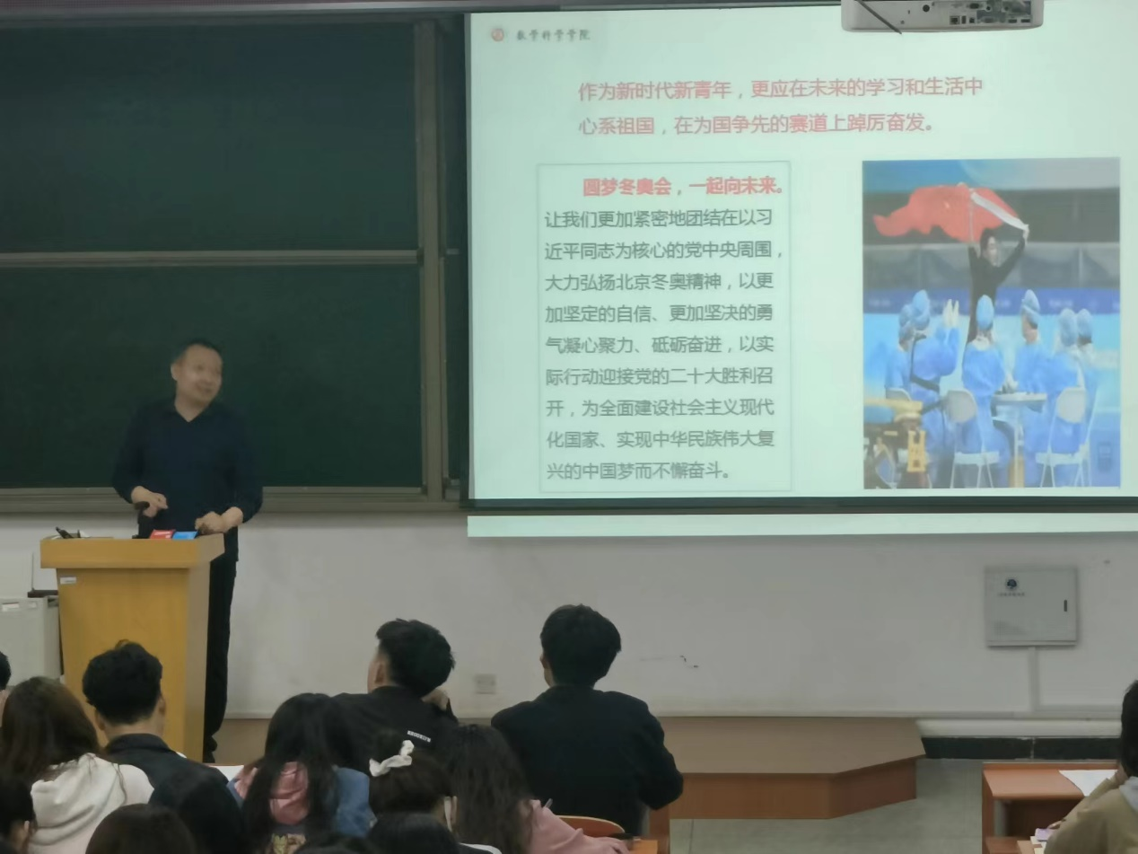 4月14日下午,我院在A10–103教室举行了题为“弘扬北京冬奥精神,奋发有为新时代”的主题党课。2022年上半年全体积极分子参会,学院党委书记董朝宗担任主讲人。