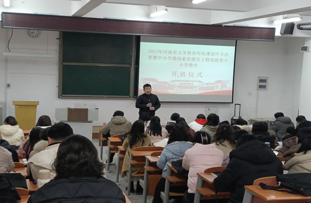 3月2日上午,2023年河南省义务教育师资薄弱环节改善暨中小学教师素质提升工程培训项目:省级骨干教师小学数学培训班开班典礼在A10-103举行,洛阳师范学院数学科学学院院长刘迎照出席此次典礼。