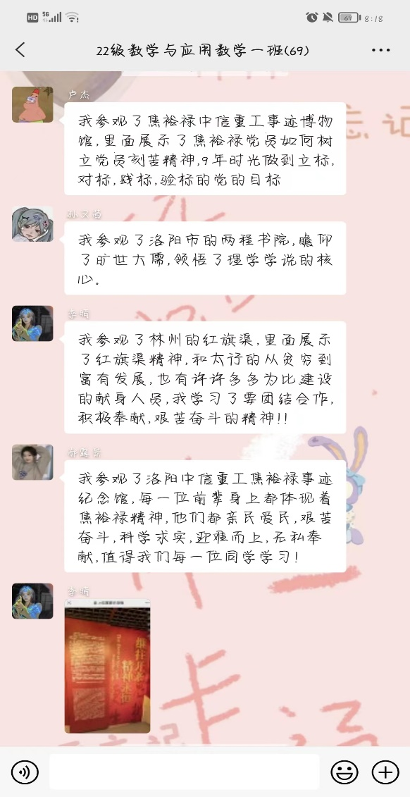 会议最后,各班开展了“云教育”—网上参观廉洁文化基地活动。同学们利用河南省廉洁文化教育中心网上展厅,来到了不同的地方参观学习,纷纷在班级群中发表自己的感想,热议廉洁文化教育内涵,深刻领悟廉洁自律精神,主动提出要严格要求自己,树立规矩意识,培养良好学风,在祖国的发展中勇担使命,奋勇前进!