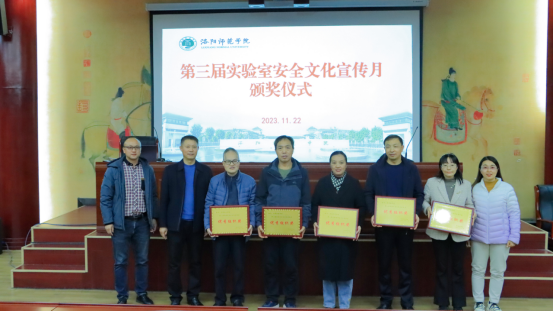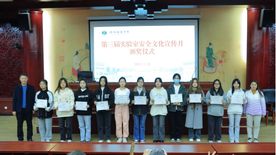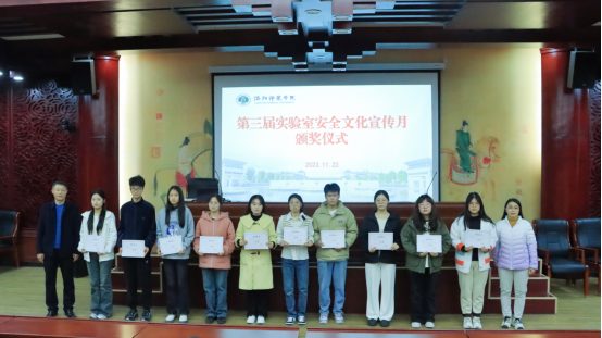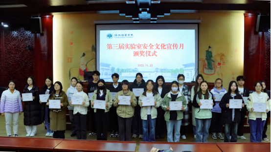 为表彰先进,树立典型,学校于11月22日下午在逸夫楼G5-102报告厅举行第三届实验室安全文化宣传月颁奖仪式。对表现突出的外国语学院等5个单位进行表彰,颁发“优秀组织奖”牌匾;对在2023年实验室安全知识大赛中获奖的卫芳宁等50名同学进行表彰,颁发荣誉证书和奖品。