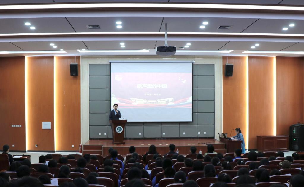 “风在吼,马在叫,黄河在咆哮,黄河在咆哮……”嘹亮的歌声响彻在报告厅。文学院团委副书记赵子晗沉浸式讲述“歌声里的中国”,《松花江上》《大刀进行曲》《保护黄河》等一首首抗战歌曲引起了全场大合唱,大家透过抗战歌曲重温党史,深刻感悟伟大的抗战精神。