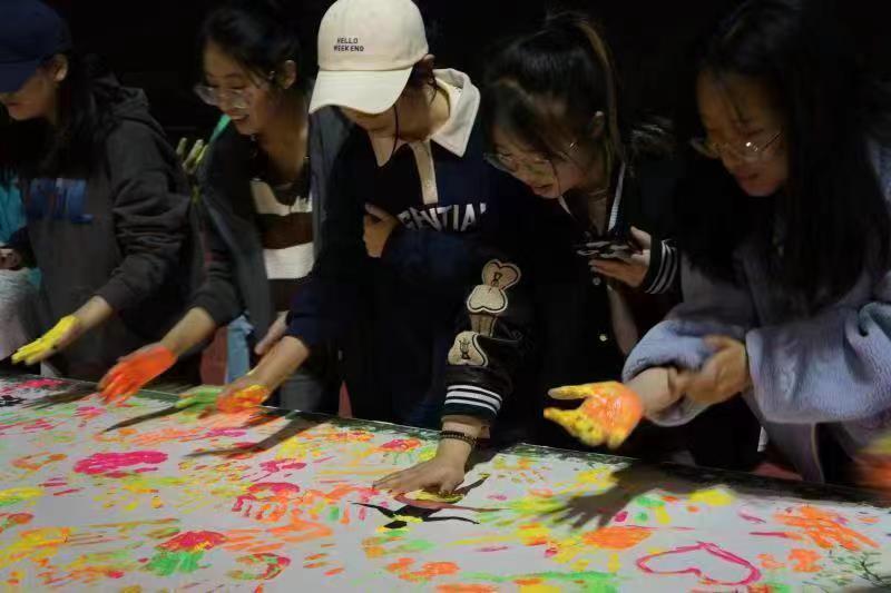 除健步走之外,活动还设置了“花开无言,诗词赋情”“众人皆说,成之于语”“一心两用,神机妙算”等趣味游戏,将诗词文化、成语文化、河洛文化等中华优秀传统文化融入其中,内容丰富,愉悦身心,同学们乐此不疲,踊跃参与,在春风沉醉和荧光点缀的夜晚,尽情享受运动带来的乐趣。大家脸上洋溢着灿烂的笑容,纷纷表示活动不仅锻炼了身体、舒展了心情,更增长了知识、增进了同学间的互动交流。活动最后,同学们用荧光粉将手掌印留在海报上并进行了合影留念。