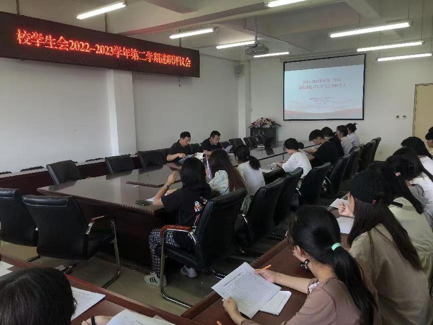 为深入学习宣传贯彻党的二十大精神,进一步深化学生会改革,加强学生会自身建设,落实《关于巩固高校学生会(研究生会)改革成果的若干措施》,6月15日下午,我校学生会在敦行楼412会议室顺利开展2022—2023学年第二学期述职评议工作。校党委学工部、团委相关老师及各学院10余名学生代表担任评议会成员。