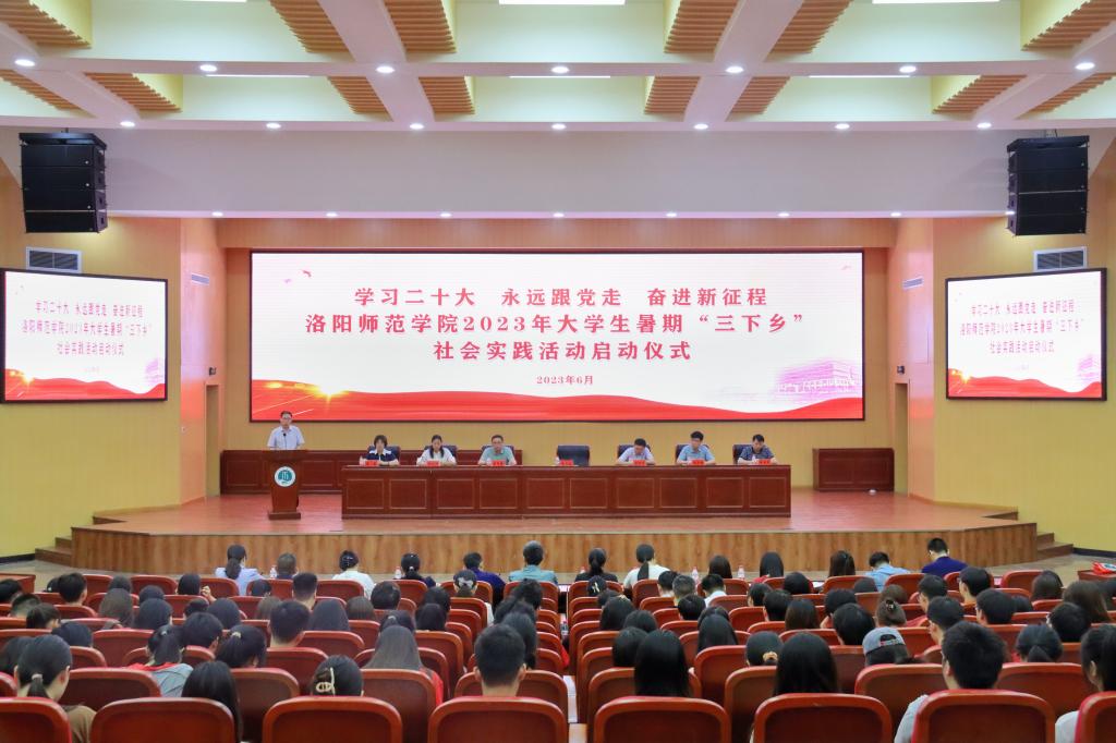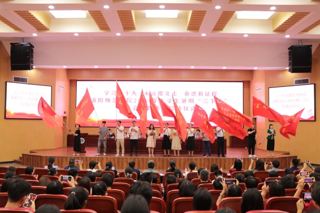 党委宣传部部长索秋平宣读《洛阳师范学院2023年大学生暑期“三下乡”社会实践活动方案》。与会领导为“理论宣讲”“红色寻访”“乡村振兴”“社区实践”等19支社会实践重点团队代表授旗,高高飘扬的旗帜彰显了洛师青年投身实践、砥砺奋进的青春姿态。