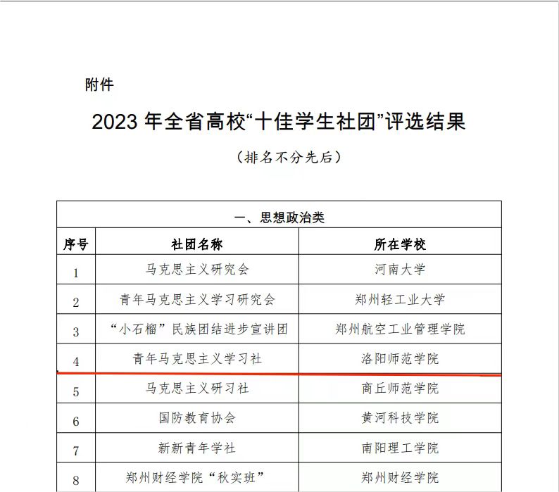 近日,中共河南省委教育工作委员会、河南省教育厅公布2023年全省高校“十佳学生社团”评选结果,我校青年马克思主义学习社荣获“十佳学生社团”荣誉称号。