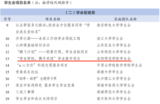 近日,中华全国学联公布了由共青团中央指导、全国学联主办的全国高校学生会组织“我为同学做实事”项目交流展示活动名单,经学校自荐、省级推报、全国遴选,我校学生会“学业帮扶,携手共进”学业提升项目成功入选。