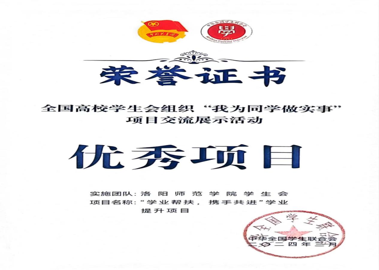 近日,由共青团中央指导,全国学联主办,共青团贵州省委、贵州省学联、贵州师范大学承办的全国高校学生会组织“我为同学做实事”项目交流展示活动在贵阳举行。本次活动吸引了全国1724所高校、3581个项目参与其中,经学校自荐、省级推报、全国遴选,我校学生会“学业帮扶,携手并进”学业提升项目脱颖而出,作为全国300个入选项目之一,与全国各大高校共同参与集中展示、现场答辩等环节,最终获评全国高校学生会组织“我为同学做实事”项目交流展示活动“优秀项目”。